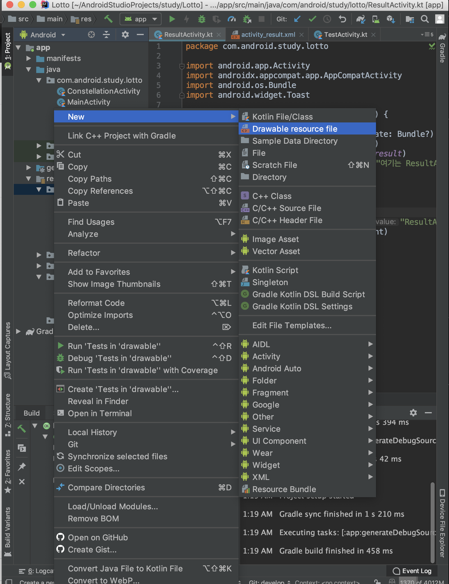 - drawable > 우클릭 > Drawable Rsource file 추가.